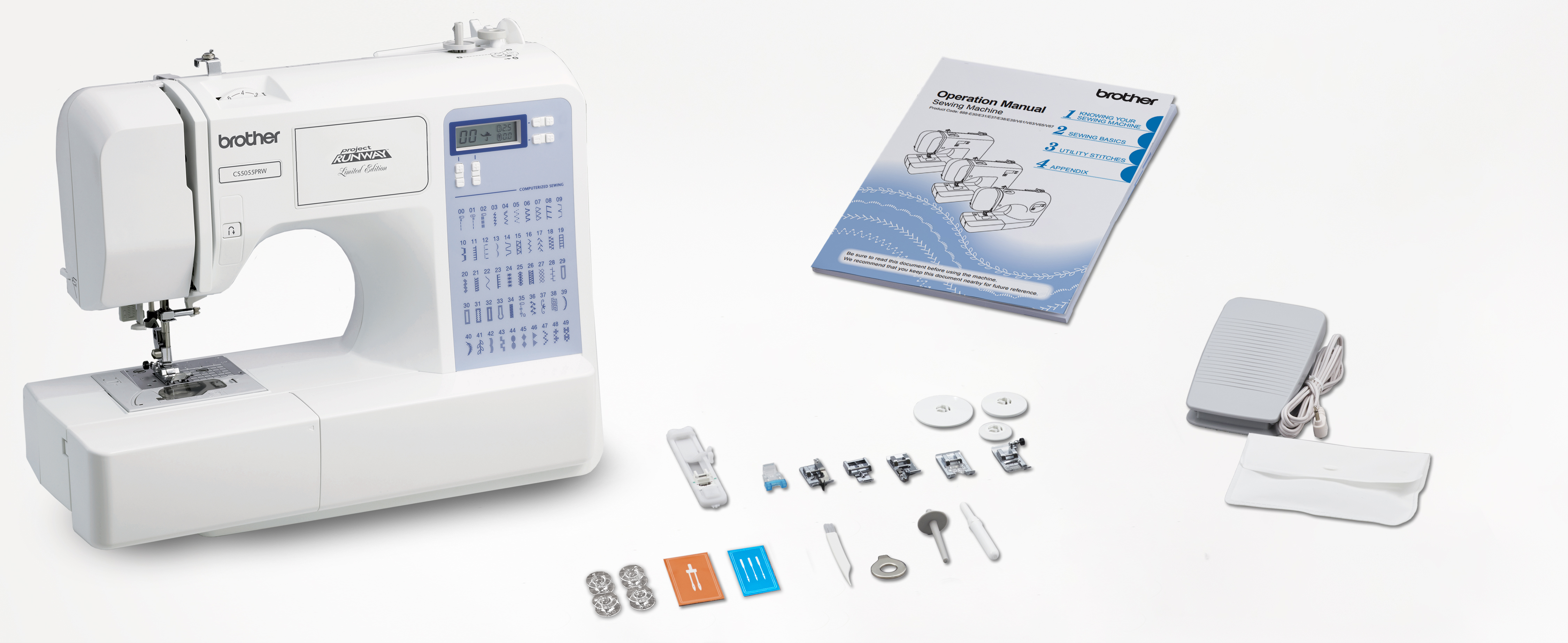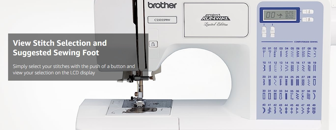 Create high-end fashions at an affordable price, with this incredibly easy to learn and use, exclusive Brother Project Runway computerized sewing machine. The CS5055PRW offers complete couture-level solutions to help you leverage your sense of style into one-of-a-kind, runway-ready fashions. Experience easy, reliable threading of both top and bottom threads; virtually effortless sewing on a wide range of fabrics, and the ability to add professional quality buttonholes, zippers, decorative top stitching and neat, overcasting edges to your favorite creations. The CS5055PRW includes 50 built-in stitches that cover a wide range of utility, decorative, heirloom and quilting stitch functions, and your entire selection of built-in stitches is printed on the front your machine, for easy reference. Simply select your desired stitch on the informative LCD display screen and adjust the stitch to your specific needs. And for truly custom results, choose from the 5 one step buttonhole styles that are actually custom-sized to fit your specific buttons. Includes 6 specialty sewing feet, complete bilingual English and Spanish instruction manual, and a 25-year limited warranty. ;.