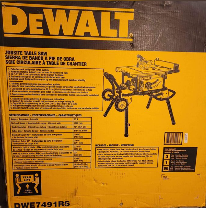 Features a 15.0A high torque motor with the power to cut pressure treated lumber and hardwoods. Rack & Pinion Telescoping Fence System Make fence adjustments fast, smooth and accurate. Rolling stand designed for easy set up and breakdown with excellent stability. Other Specs: Max rip to left of blade – 22inch | Max rip to right of blade – 32-1/2inch | Max width of Dado – 13/16inch | Arbor size – 5/8inch | Amps – 15 | Depth of cut at 45inch – 2-1/4inch | Depth of cut at 90° – 3-1/8inch | No Load Speed: 4800 RPM. Your purchase includes one Dewalt table saw, 10inch 24-tooth carbide blade, rolling stand, push stick, miter gauge, rip fence, 2x blade wrenches, blade guard assembly manual.