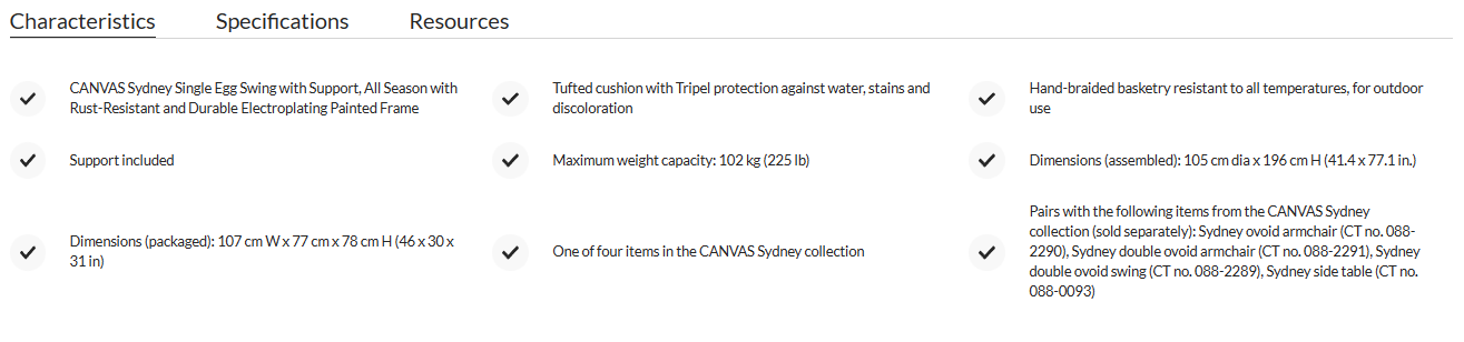 Add a fun and comfortable seat to your outdoor space with the CANVAS Sydney Single Egg Swing with Support. Unique patio swivel chair with a steel frame with a powder and electroplating finish to resist rust and weather, for added durability. Simple egg swing designed for outdoor use and made of weatherproof hand-braided wicker with stylish open weave. Wicker swing with a TRIPEL treated padded cushion to protect it from rain, stains and discoloration caused by the sun. Steel swing which is the perfect place to relax or enjoy a book while gently swaying. Steel swing including a safety strap to attach the chair to the support and prevent excessive tipping. Swing supplied with the stand having a maximum capacity of 225 lbs. Swing to be assembled and measuring 41.4" D x 77.1" H. This charming outdoor swing pairs with other furniture from the CANVAS Sydney collection to help you create a harmonious décor for your outdoor space: CANVAS Sydney egg chair (0882290), Sydney double egg chair (0882291), Sydney egg swing (0882289) and Sydney side table (0880093) sold separately.